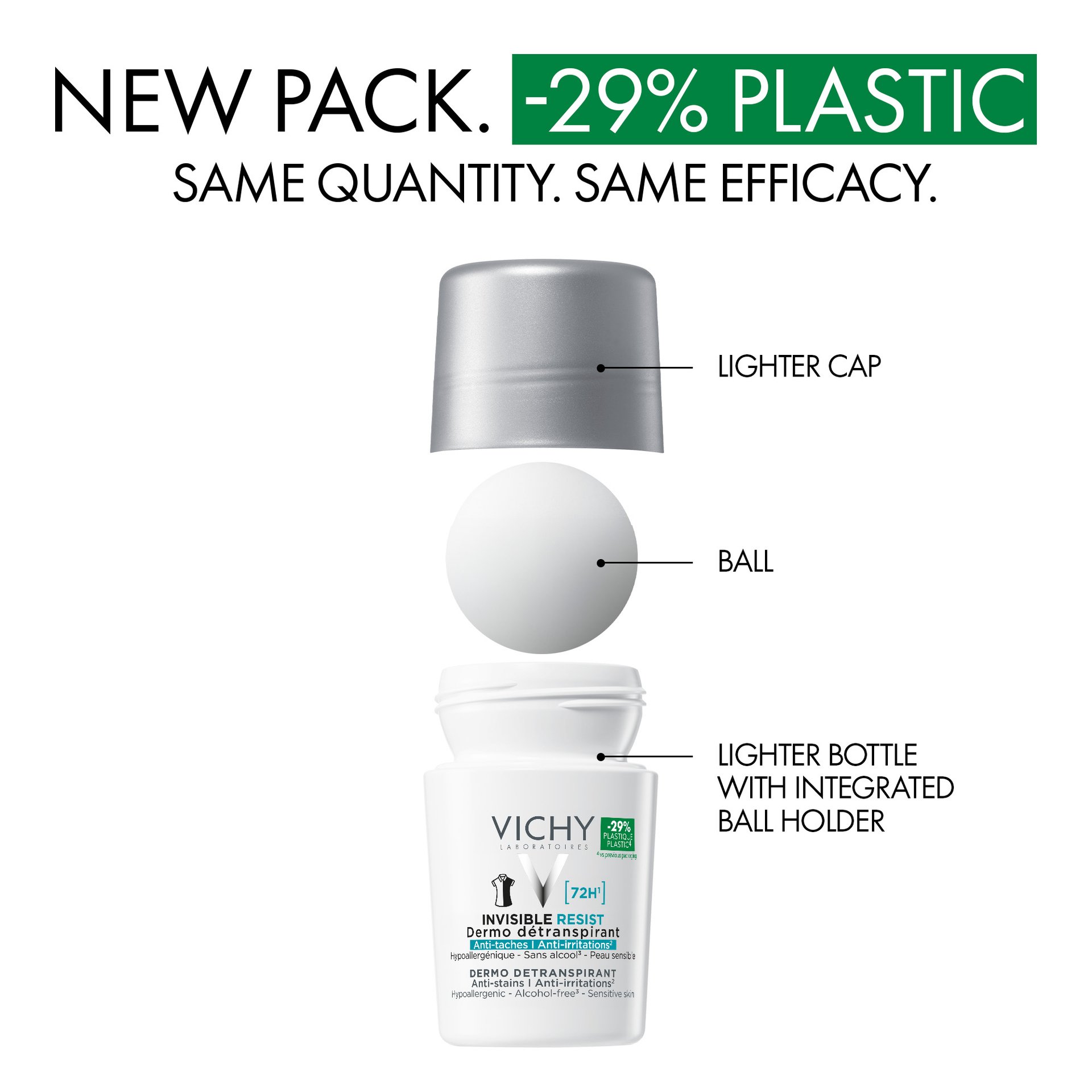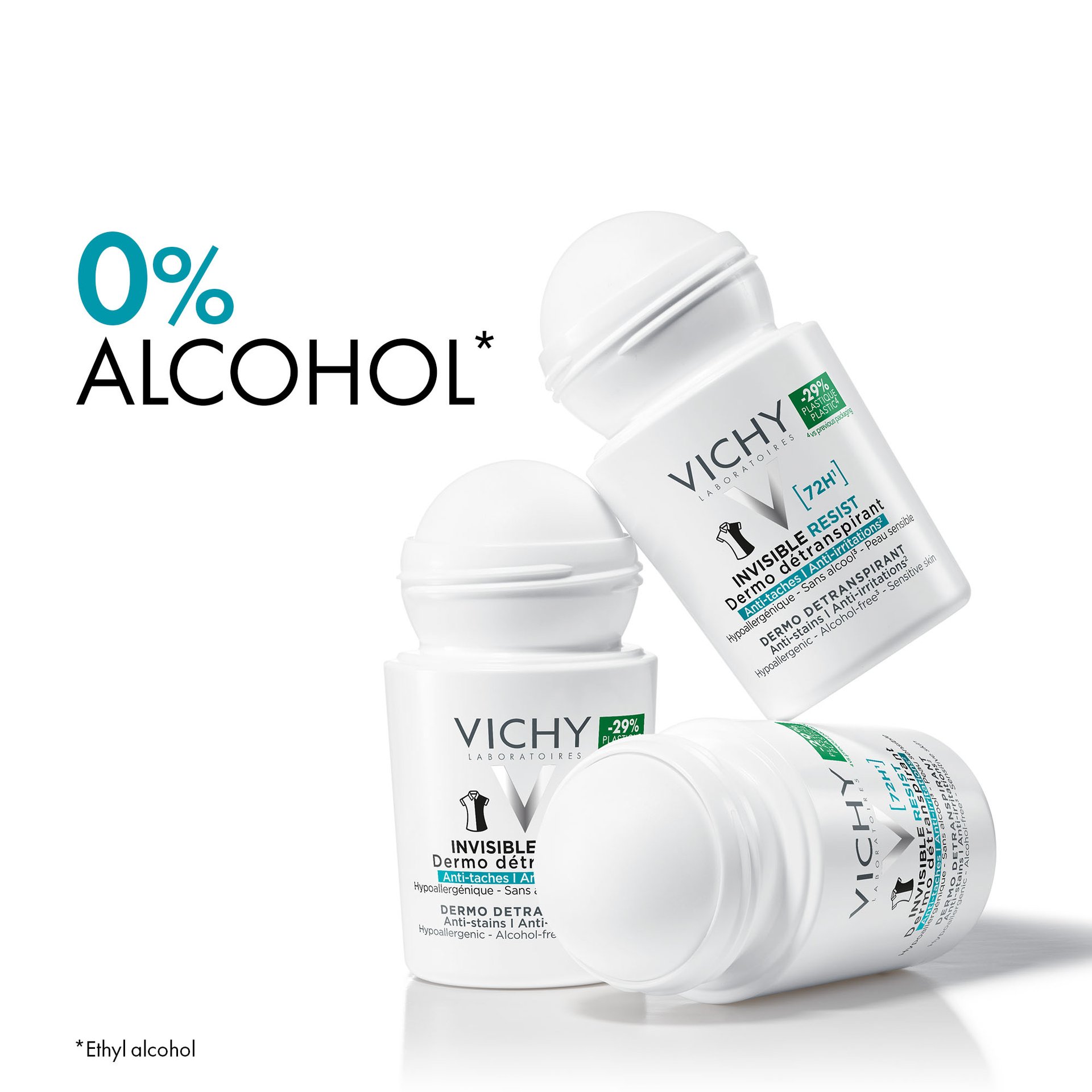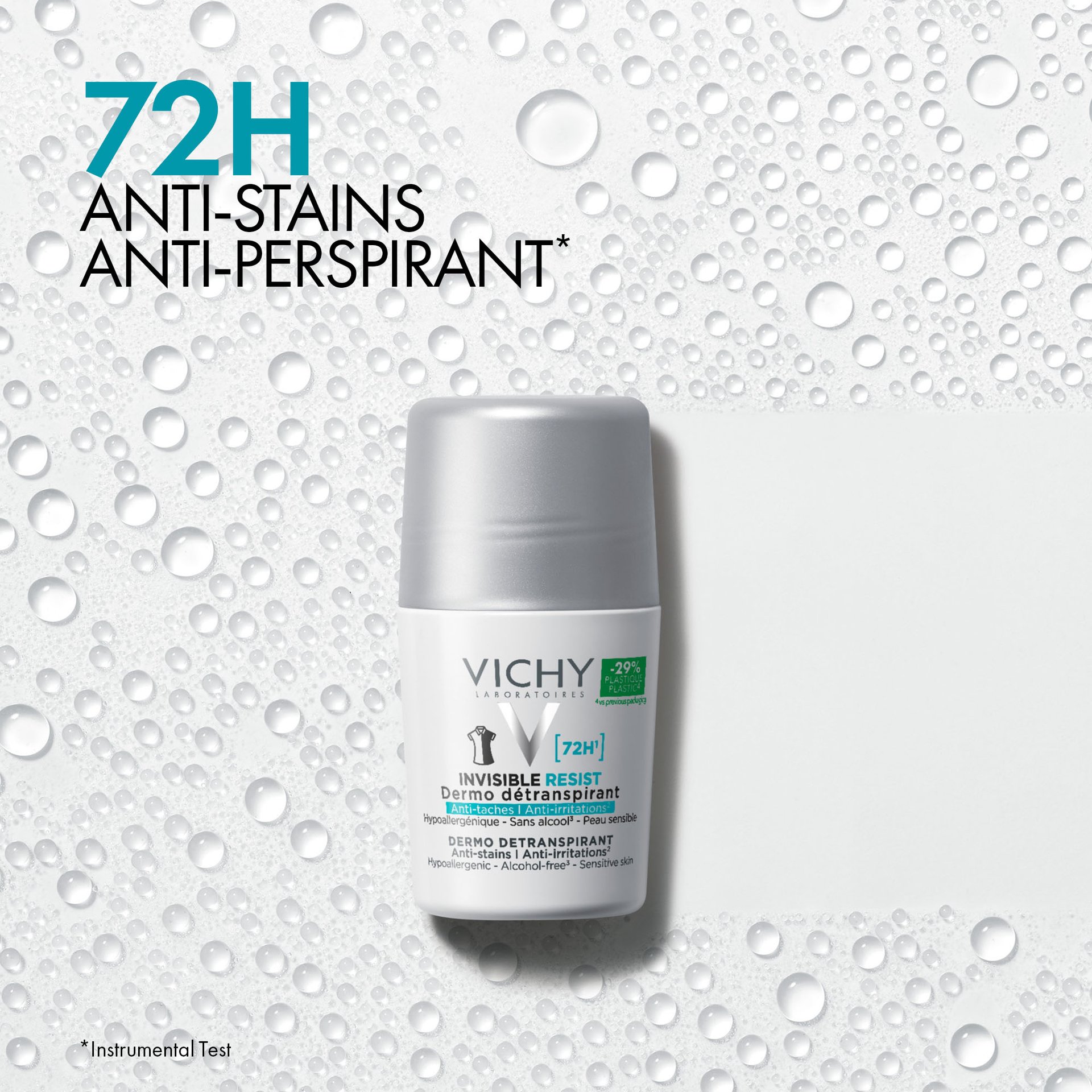 Effektiv 72T anti-perspirant deodorant formuleret til at undgå gule og hvide mærker på tøj samt beskytte hudbarrieren mod irritation, tørhed og rødme.