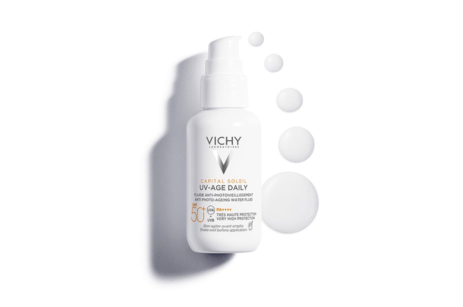 Prøv f.eks. Vichy Capital Soleil UV-Age Daily SPF50+, der er formuleret med NETLOCK-teknologi, som giver en ultratynd, modstandsdygtig og usynlig UV-beskyttelse på huden. Solcremen indeholder også niacinamid, der reducerer synligheden af hudpletter.